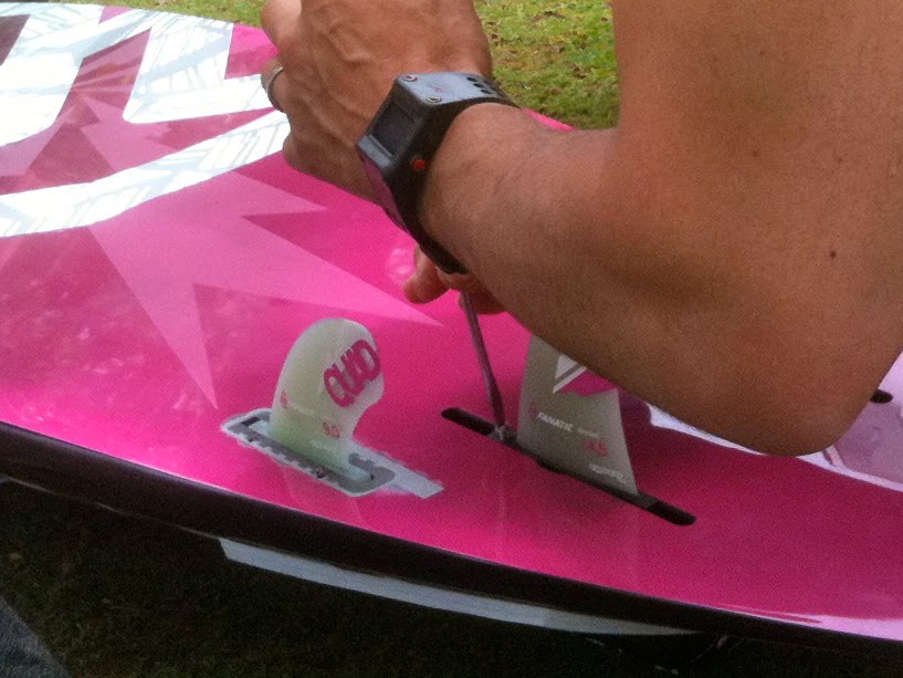quad-fenuppsättningar + lyxen av lite justerings/trim-möjligheter.Så (potentiellt) fel det verkar bli! För att inte tala om hur knepigt det är att hitta ett färdigt set fenor för US-box… … brädan är vit med röda kanter runt om